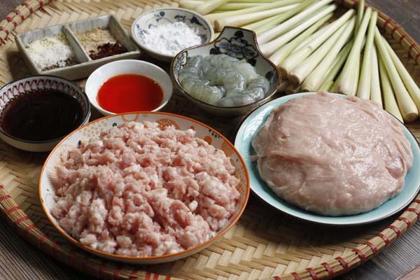Nguyên liệu cần chuẩn bị để làm nem lụi.