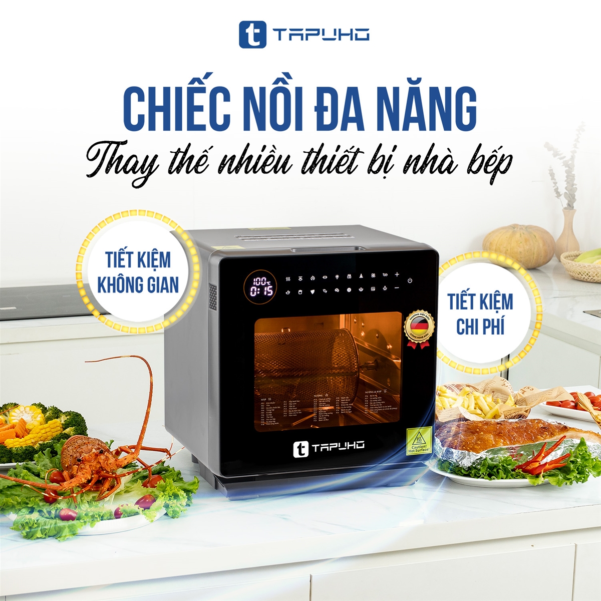 Nỗi lo không gian bếp chật hẹp không đủ không gian để chứa các thiết bị nhà bếp sẽ không còn nữa khi TAPUHO LUXURY STEAM FRYER TSF16 có thể sử dụng chức năng tương đương với 10 thiết bị nhà bếp khác nhau như : nồi chiên không dầu, nồi hấp, nồi áp suất, máy sấy hoa quả, máy ủ sữa chua, lò nướng, lò vi sóng, máy làm bỏng ngô, máy nướng bánh mỳ, ... và đặc biệt với tính năng đa dạng như vậy sẽ giúp chúng ta tiết kiệm được rất nhiều chi phí mua sắm, thời gian vệ sinh bảo dưỡng.