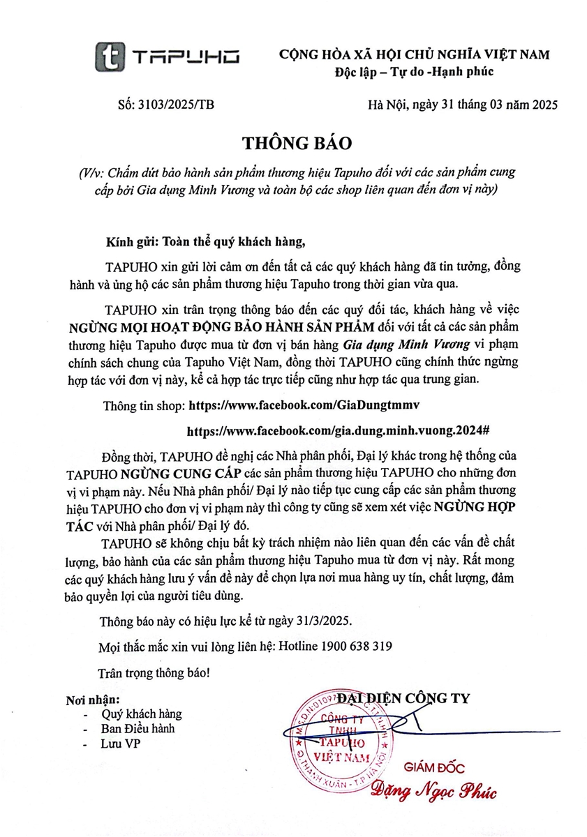 THÔNG BÁO - Chấm dứt bảo hành sản phẩm thương hiệu Tapuho đối với các sản phẩm cung cấp bởi Gia dụng Minh Vương và toàn bộ các shop liên quan đến đơn vị này.